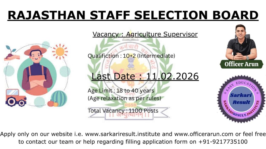 Rajasthan Staff Selection Board (RSSB) has officially released the RSSB Agriculture Supervisor Recruitment 2026 notification on its authorized website. This recruitment drive is being conducted under Advertisement No. 03/2026 to fill a total of 1100 Agriculture Supervisor posts in the Agriculture Department of Rajasthan. Candidates who are interested in Rajasthan Government Jobs and have the required educational qualifications in agriculture can apply online within the prescribed dates.